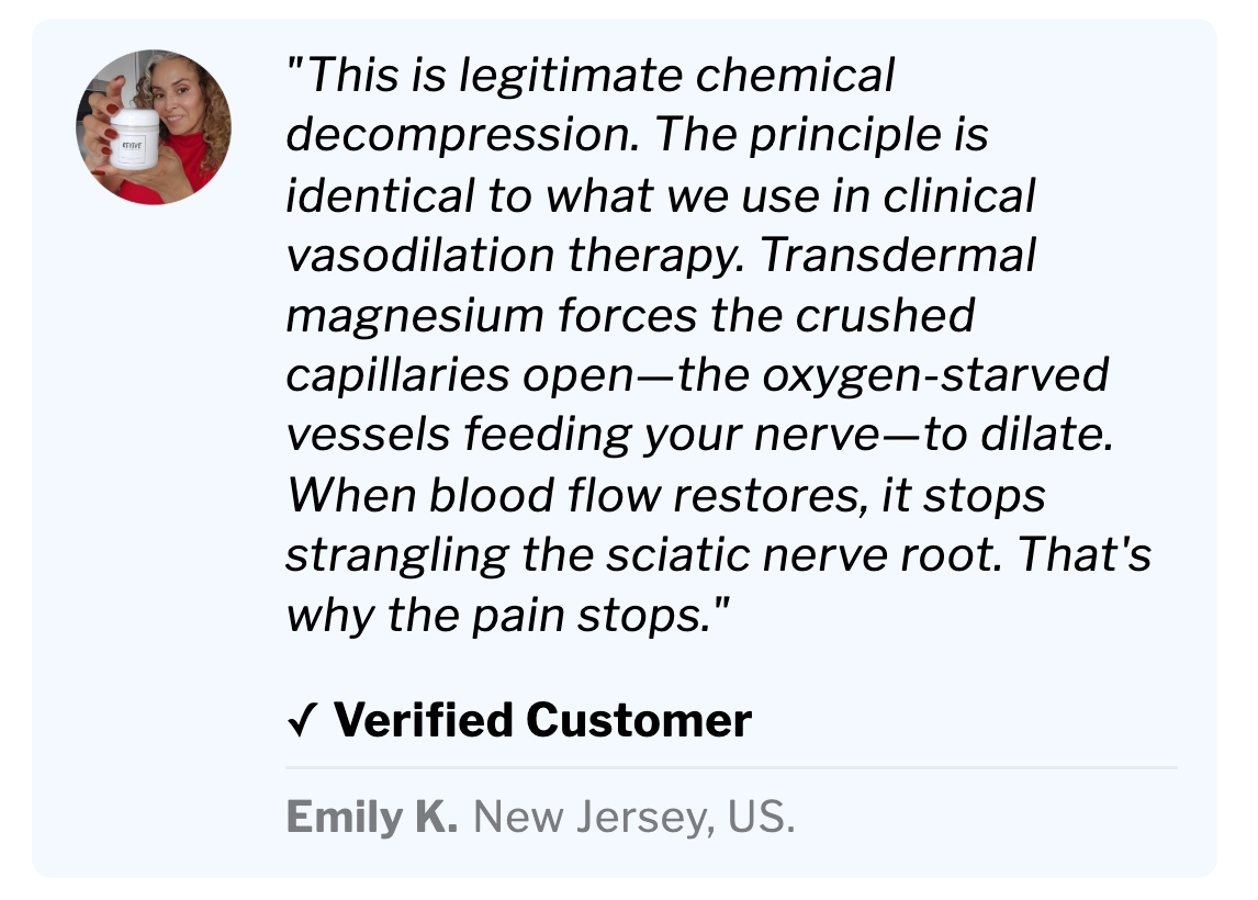 Magnesium sulfate is one of the body's most powerful vasodilators. When absorbed through the skin, it penetrates 2-3 inches deep to reach the paraspinal muscles strangling your sciatic nerve—forcing crushed capillaries open and flooding oxygen-starved tissue with blood flow.